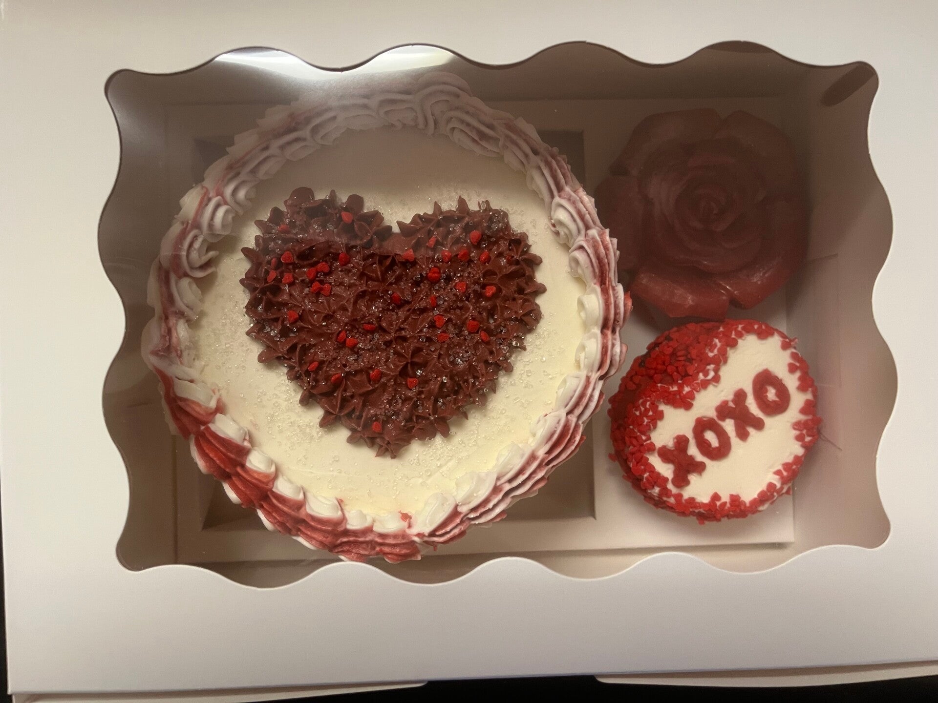 A sweet little Valentine’s feast featuring a 5" two‑layer chocolate cake paired with two rich chocolate cupcakes. Everything is swirled in velvety buttercream and dressed in romantic Valentine’s décor—perfect for sharing with your sweetheart and making the moment feel extra special.